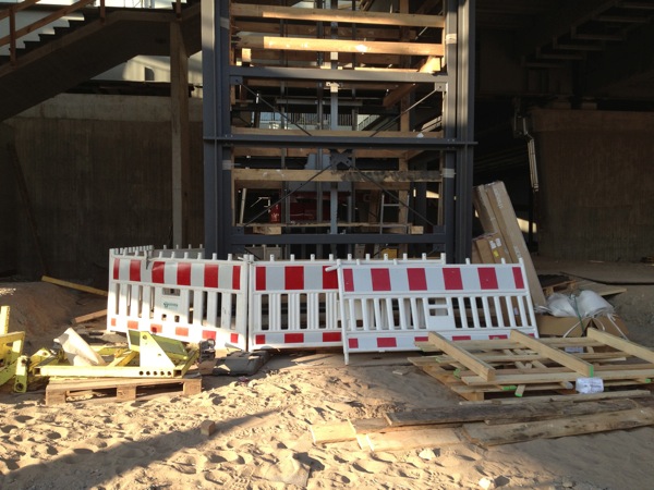 Aufzug am Ausgang Hauptstraße, der Fahrkorb wird zusammengebaut