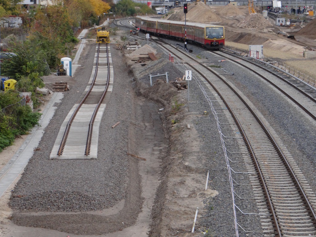 Fangen wir am Ostkreuz an: hier werden gerade die letzten Bohrpfähle für die Brückenpfeiler der neuen Kurve zum Ring gesetzt. Zwischen den Gleisen der Fernbahn und der S3 ist eine mit Grundwasser gefüllte Baugrube zu sehen, die zum Teil bis unter die Fernbahngleise reicht. Hier wird die Bedeutung bauen unter rollendem Rad am Ostkreuz besonders deutlich.Im weiteren Verlauf der künftigen neuen Verbindungskurve wurden weitere Teile des ehemaligen Bahnsteig A und der alten Verbindungskurve abgerissen. Bald ist nur noch der alte Bahndamm und teile der Rampe übrig. Aber auch bei den neuen Rampenbauwerken geht es jetzt zur Sache. Zwischen den S-Bahngleisen wurde westlich des Ostkreuz eine Baustelle samt Kran eingerichtet. Die Baustelle dient der Errichtung der neuen Rampe von und zur neuen Verbindungskurve. Sie muss anders als die alte, jeweils eine Rampe zwischen den stadtauswärts führenden und eine zwischen den stadteinwärts führenden Gleisen erhalten (Richtungsbetrieb).