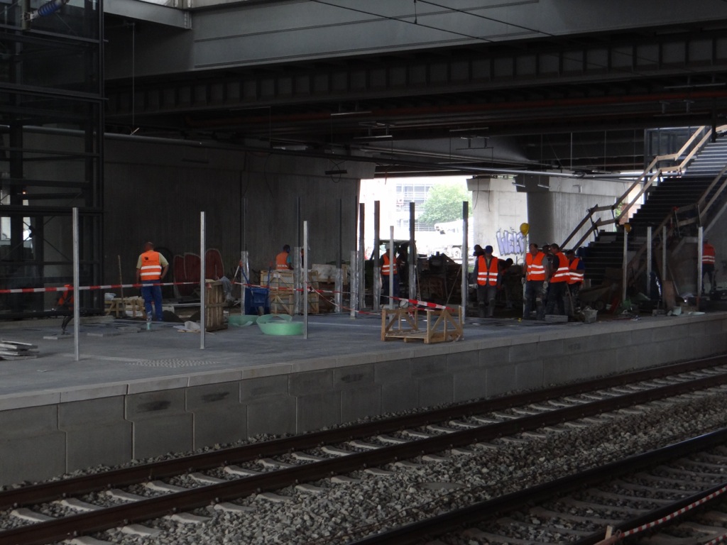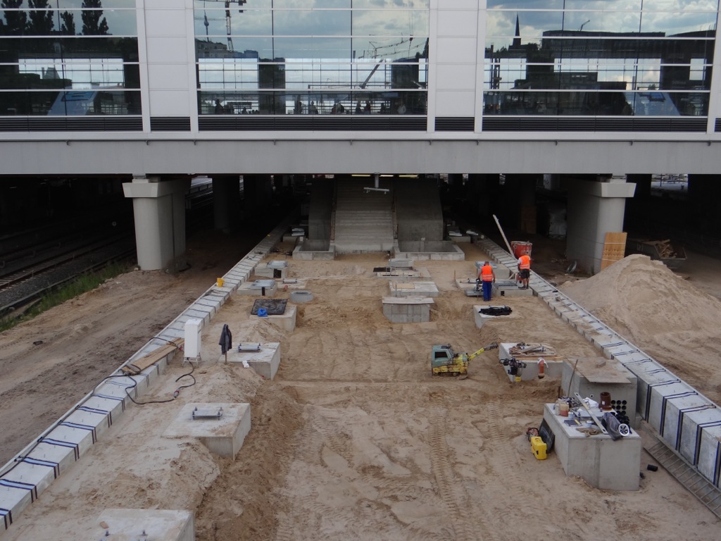 Noch ein Abstecher rüber zur Warschauer Straße: hier laufen im Bahnsteig B bereits die Arbeiten zur Herstellung der Stahlbewehrung für das Fundament der Eingangshalle. Parallel dazu wird man auch gleich das Fundament im Bereich des Bahnsteigs A errichten. Mal sehen wie schnell man hier voran kommt. Bis Oktober muss ja auch der Bahnsteig B für den beidseitigen S-Bahnverkehr hergerichtet sein.