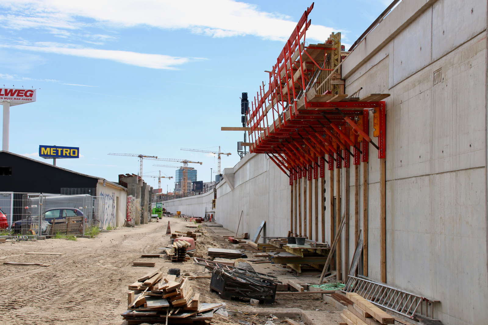 Zum Schluss werfen wir noch einen Blick auf die neue Stützwand zwischen Warschauer Straße und Ostbahnhof. Sie ist so gut wie fertig. Nach der Verschwenkung der S-Bahngleise kann die alte Stützwand abgebrochen werden und die nördlichen Gleise in ihre Endlage gebracht werden.