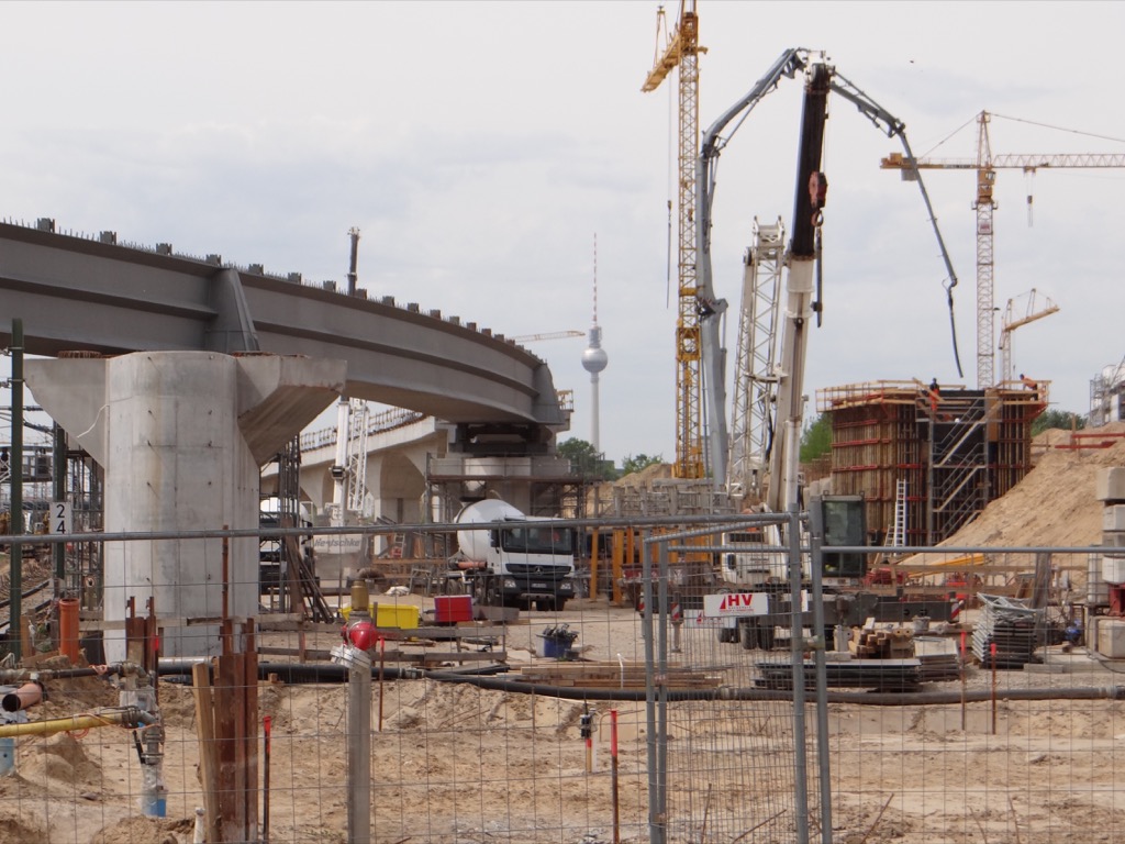 Nöldnerstraße in Rummelsburg. Blick auf die Baustelle der Stabbogenbrücke für die S3